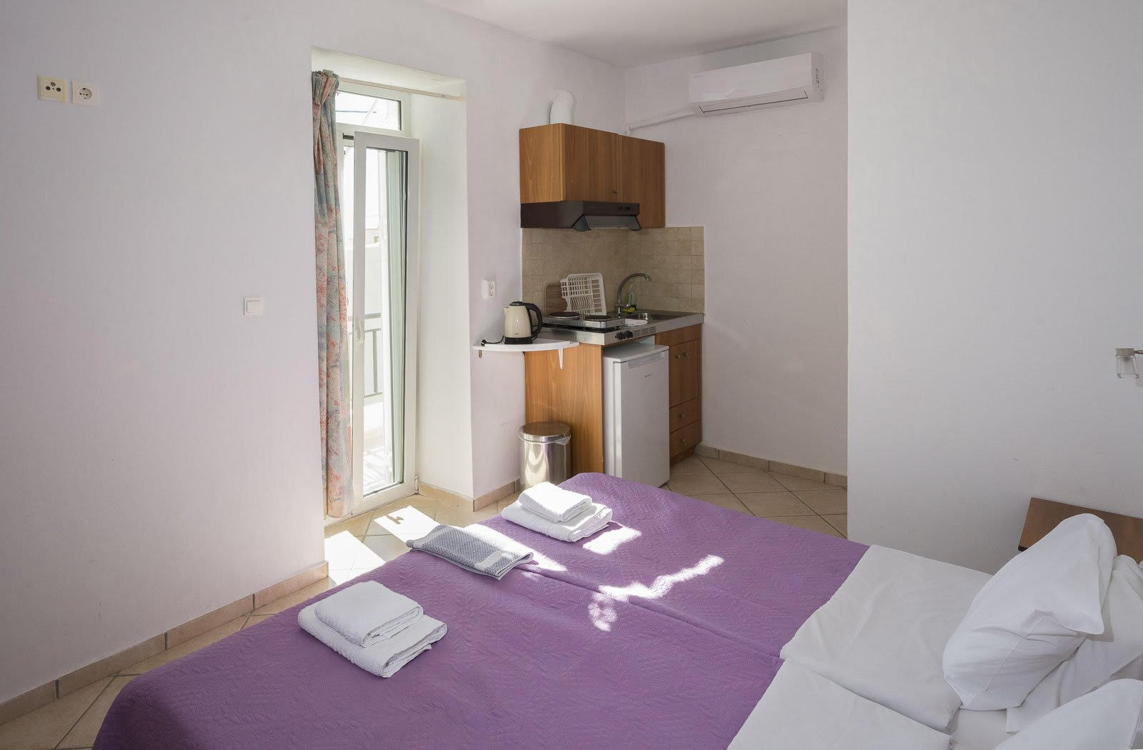 Room 6 offers a perfect blend of comfort and scenic beauty. This versatile space features one double bed (composed of two twin beds that can be separated upon request). Guests can enjoy a private balcony with breathtaking sea and mountain views. Inside, you’ll find an equipped kitchen with a mini-fridge, water boiler, plates, cutlery, and all the essentials for preparing your own meals.